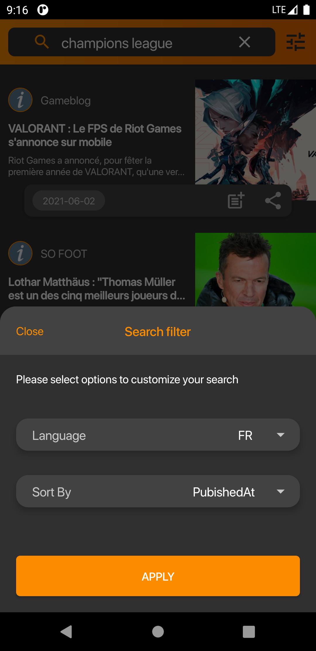 - Ability to search news by keyword, language, sorted by popularity, date of publication or relevance.