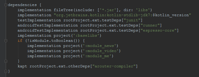 主要就是集成每一个模块,最终打包成一个完整的 apk ,其中 gradle 做了如下配置,根据配置文件中的 isModel 字段来依赖不同的业务组件;