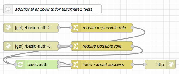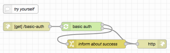 The following example illustrates how to integrate basic authentication into Node-RED flows. Just import it and navigate your browser to the shown entry point.