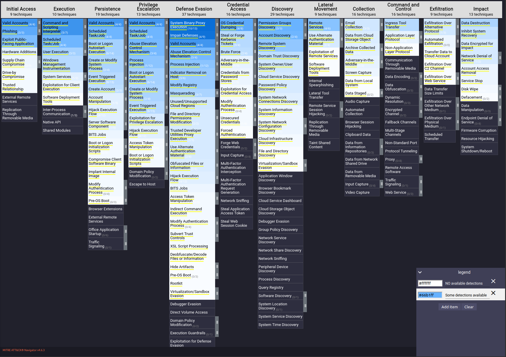 To view an up-to-date detection coverage map for all the content tagged with MITRE techniques visit: https://mitremap.splunkresearch.com/ under the Detection Coverage layer. Below is a snapshot in time of what technique we currently have some detection coverage for. The darker the shade of blue the more detections we have for this particular technique. This map is automatically updated on every release and generated from the generate-coverage-map.py.