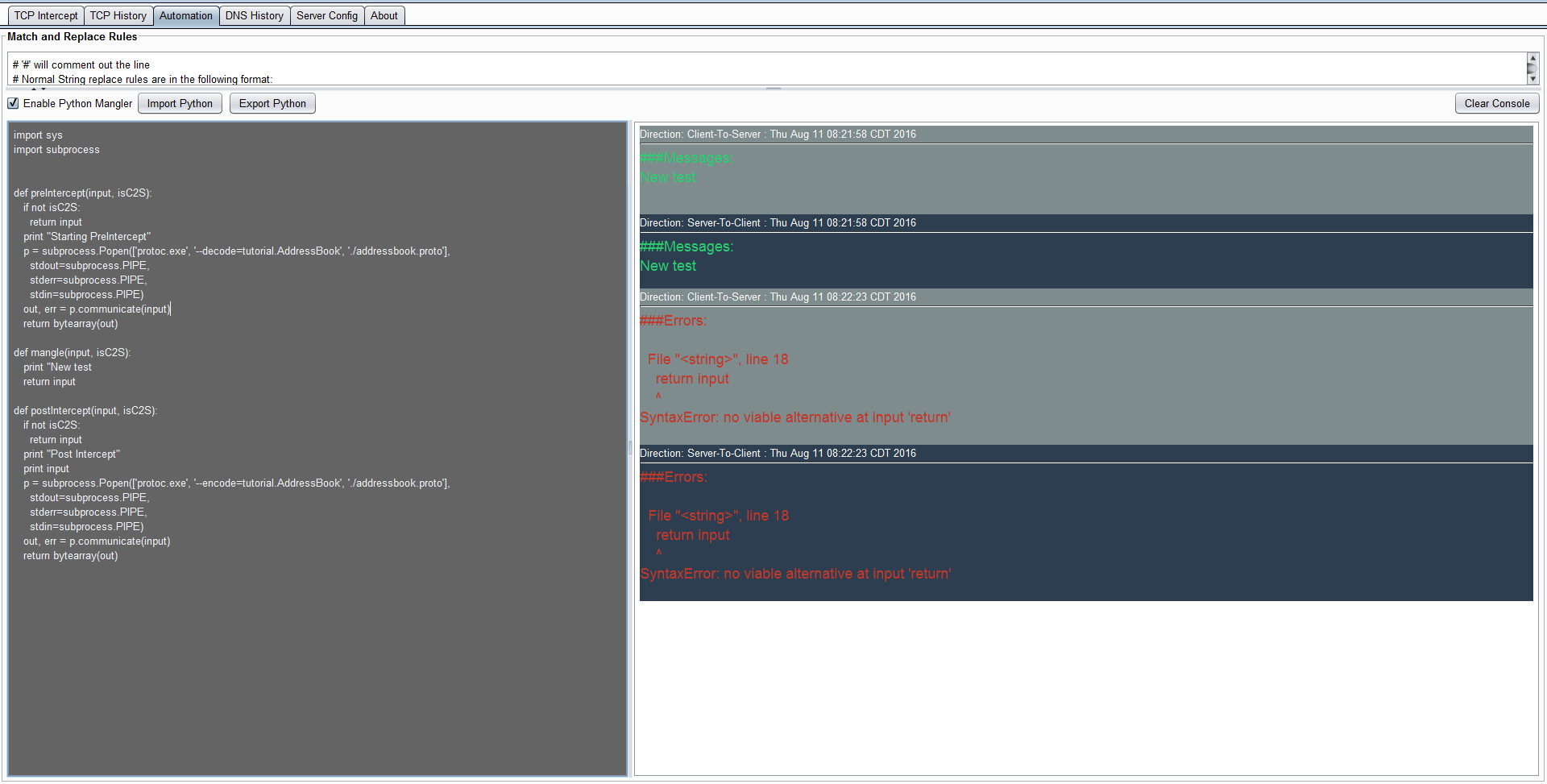 If the ‘Enable Python Manger’ is left uncheck (default) then the Match and Replace Rules are used. It supports both hex, string, and directional replacement. The ‘#’ can be used to comment out a line and rules are updated as soon as you press a single key. If you want to replace the string ‘test’ with ‘hacked’ then you could use the following rule: