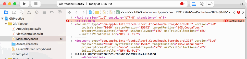 • NOTE: In this particular example, the conflict is in the Main.storyboard file. We are usually looking at the Interface Builder view of this file, so to reveal the underlying code, right-click on the Main.storyboard file and choose, Open As -> Source Code.