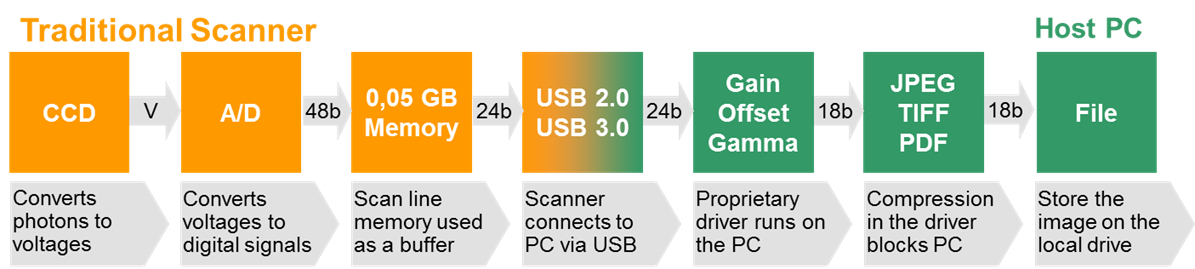 Traditional scanners depend heavily on PC-based drivers, often built with third-party software not optimized for scanning. Their performance is limited by the host PC’s resources, which are often already allocated to other tasks, affecting scanning speed and quality.