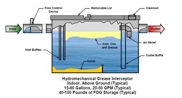 Illustrated at left is a hydromechanical grease interceptor [Bay Area Pollution Prevention Group BAPPG (2011) who have publised a series of helpful documents listed below.]