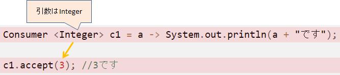 Consumer <Integer> c1 = a -> System.out.println(a + "です");