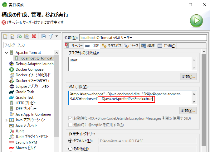 Tomcatの引数の最後に上記を追加します。
