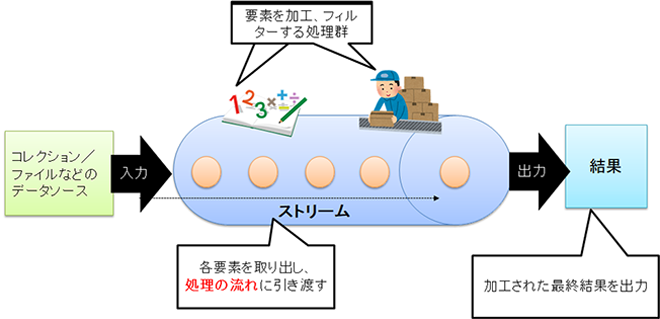 Stream APIは、繰り返し処理のためのAPIです。コレクション、ファイルなどのデータソースから個々の要素を取り出して、これを処理の流れ(=Stream)に引き渡すためのしくみを提供します。Streamの中ではデータが加工されていき、出口で加工した結果を得られます。