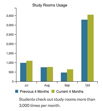- Bar chart with summary data by month, for 12 months, presented as month-to-month, year-to-year comparisons (see the study rooms usage chart above for an example)