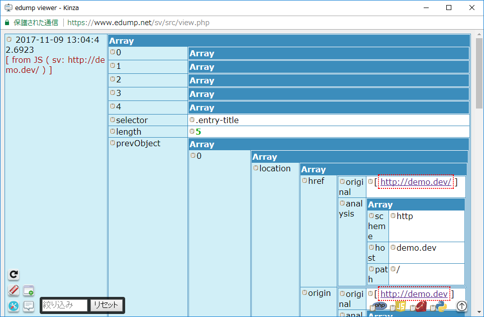 「デベロッパーツール&console.log()」ほど万能ではありませんが、ちょっとした変数参照ならedumpを用いたものの方が、console.log()よりは手軽そうです。