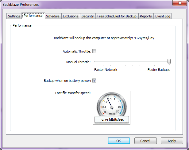 It’s not all sunshine and roses though. The client has an exclusion list of directories so it’s easy to exclude directories you don’t want backed up. Sensibly, it doesn’t backup “Program Files” or other system directories by default. However, I’d rather have an include list because on this machine I really only care about my photos, some documents and my Thunderbird mail directory and I know where they live. It’s a small quibble and probably one I’ll soon forgive when my machine goes belly up and I’m desperately looking for a secure cert or the settings for some obscure program!