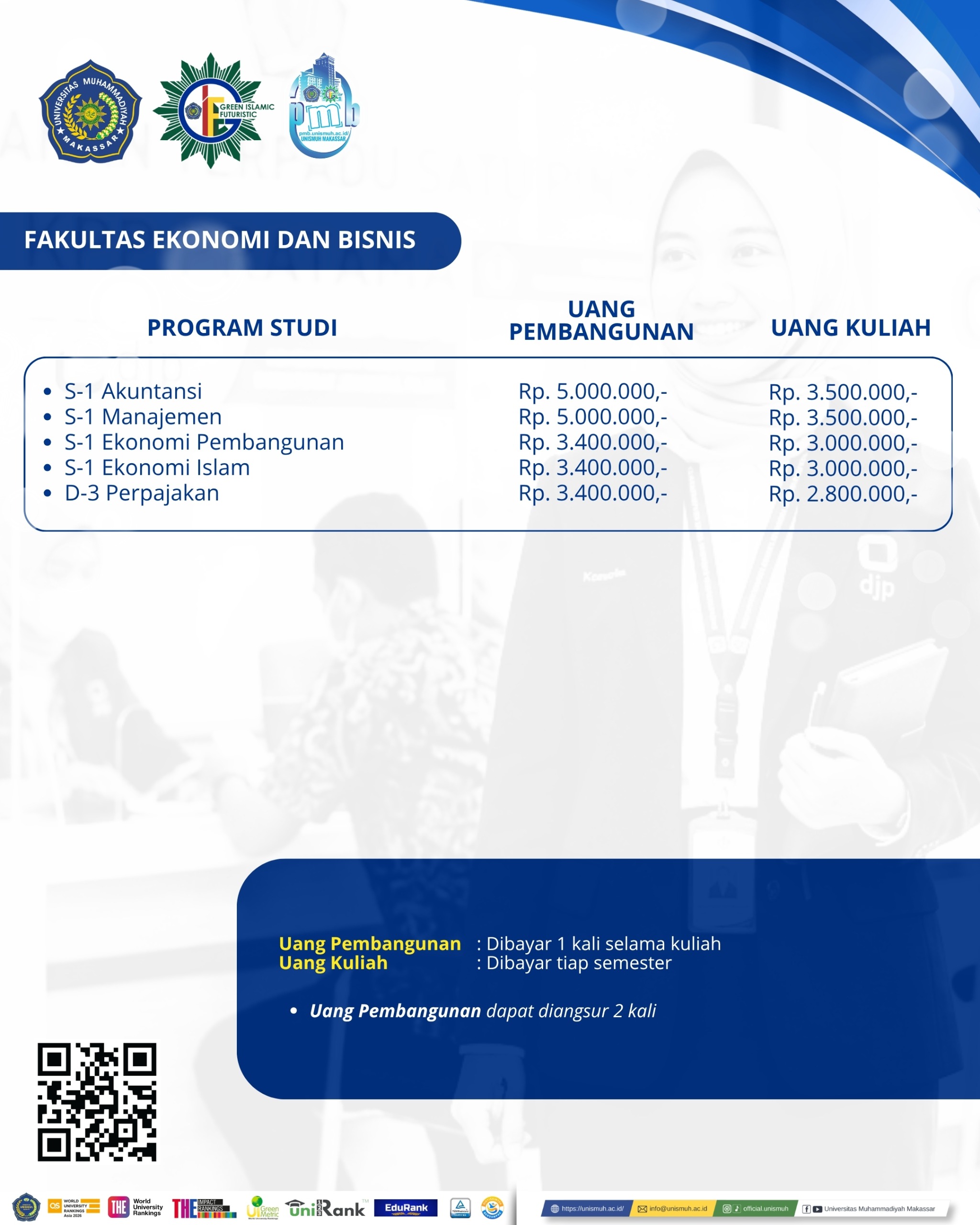 Biaya kuliah di UNISMUH relatif terjangkau dibandingkan dengan perguruan tinggi swasta lainnya.