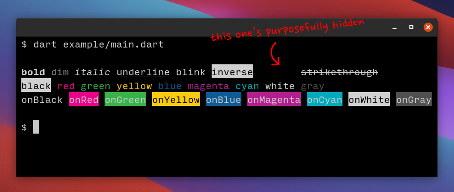 Node's chalk is the library that inspired tint the most but the naming of the APIs such as onMagenta instead of bgMagenta and certain aspects of the library are mostly influenced by the console crate from Rust. The ansicolor and ansi_styles packages also provide the same functionality but with a different delivery for the usage. But I personally find extension methods syntactically more fun to use.