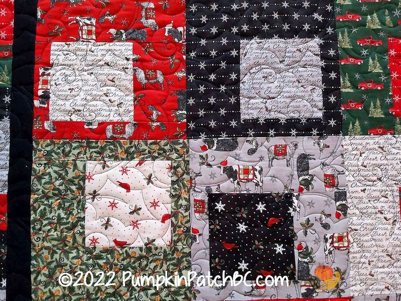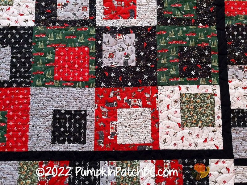 After Christmas is before Christmas, right? So here is a look at another holiday quilt, this one made by Karen. Doesn’t the layout look like stacked gift boxes? A wonderful idea for a Christmas quilt. The pantograph we used is called Holly Berries, an easy choice given that there were holly-themed fabrics in the quilt.