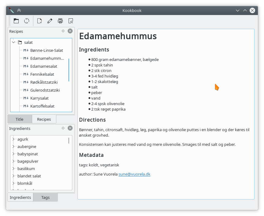 Some people has a large recipe collection in KRecipe and would like to try out KookBook. I wrote a convertion python script now available. It works in “current directory” and reads the krecipe database from there and outputs KookBook markdown files in same repository. It has so far been tried on 1 database.