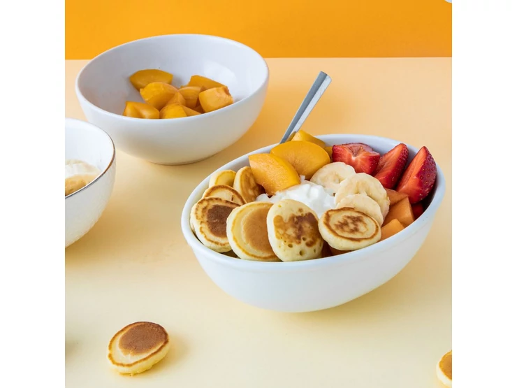 Puha és aranybarna mini palacsinták – tálaljuk egy tálban friss gyümölcsökkel, krémes görög joghurttal és egy kis mézzel! Könnyű, édes és színes, kiváló egy vidám reggelihez vagy uzsonnához, finom ízekkel és puha textúrával.
