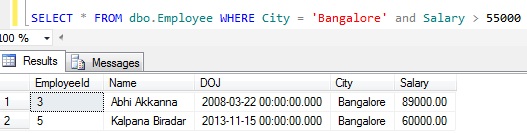 Demo 1 Using Boolean Operator AND: Get all the Employees whose City is Bangalore and Salary is above 55000