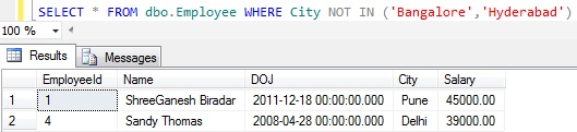 Note: This query ignored the employees whose City column value is NULL, because NULL value can’t be compared with some value (i.e. Null means unknown value, so it can’t be used to compare with any know values).  The only operation we can do with NULL is we can check whether it is NULL or NOT NULL as shown in the below Demos 3 an 4.