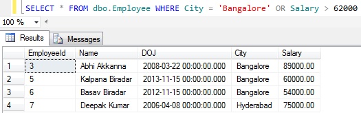 WHERE City = 'Bangalore' OR Salary > 62000