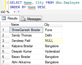 Demo 2: Sort the Employee records based on Name column value in the descending order. Here using the keyword DESC in conjunction with ORDER By clause to sort the records by Name in Descending order.