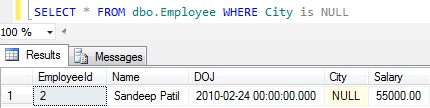 Note: The above query didn’t return the employees whose is CITY column value is NULL. As explained previously NULL means unknown value, it can’t be compared with a known value.