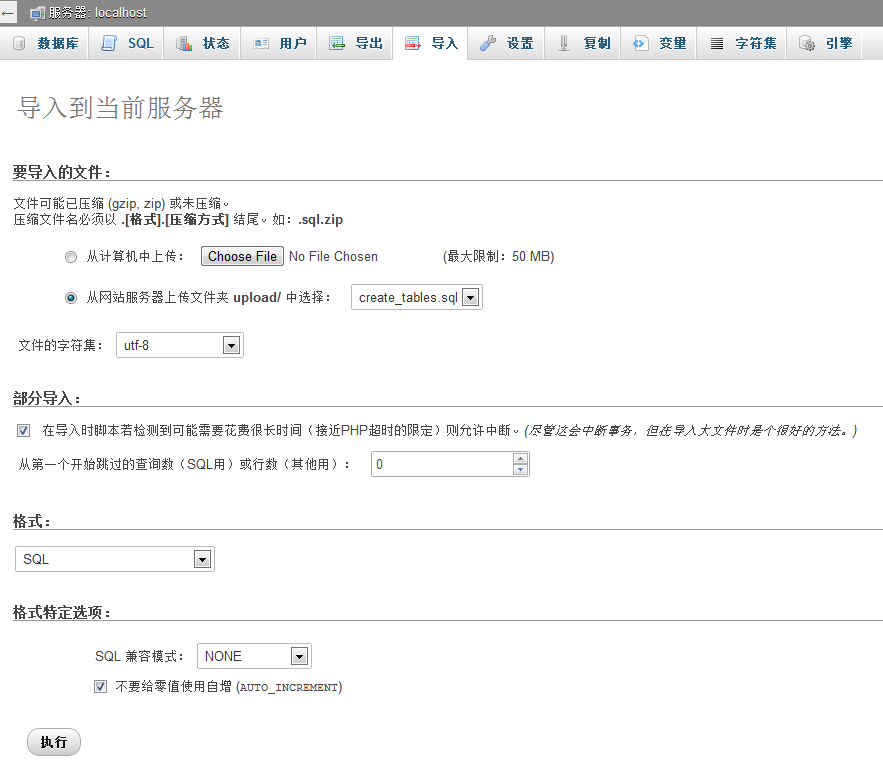 2、导入最新的 sql 文件,将数据库 phpmyadmin 中新增的一张表 pma__savedsearches 创建出来。在安装最新版 phpMyAdmin 时,update.sh 脚本已经把最新的 create_tables.sql 复制到网站服务器上传文件夹 upload/ 中。在 phpMyAdmin 的导入标签中,执行该 sql 文件即可。