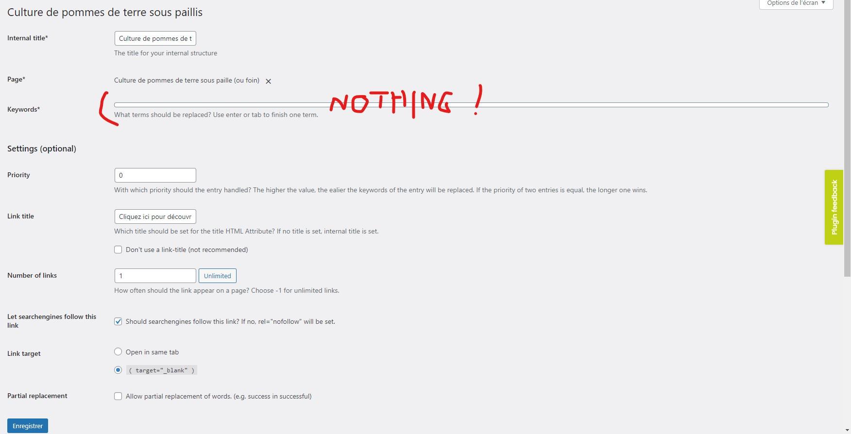 2) Sometimes, when I enter too many keywords, or the keywords are too long (I’m not sure if it’s one or the other reason), the system doesn’t save any keywords. . without an error being reported. Is there a keyword limit for an internal link? Or a character limit for a keyword?