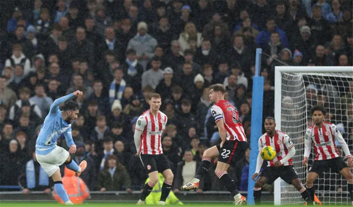تقدم فريق مانشستر سيتي بهدف أول أمام برينتفورد، خلال المباراة بين الفريقين ببطولة كأس رابطة الأندية الإنجليزية "كاراباو".