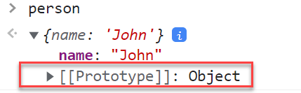 let person = {'name' : 'John'}Code language: JavaScript (javascript)When examining the person object in the console, you’ll find that the person object has a property called prototype denoted by the [[Prototype]]: