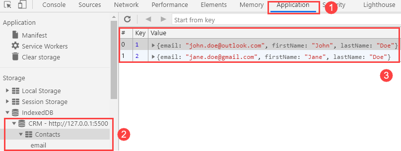 If you open the devtools on the web browser, you’ll see the CRM database with the Contacts object store. And in the Contacts object store, you’ll see the data there as shown in the following picture: