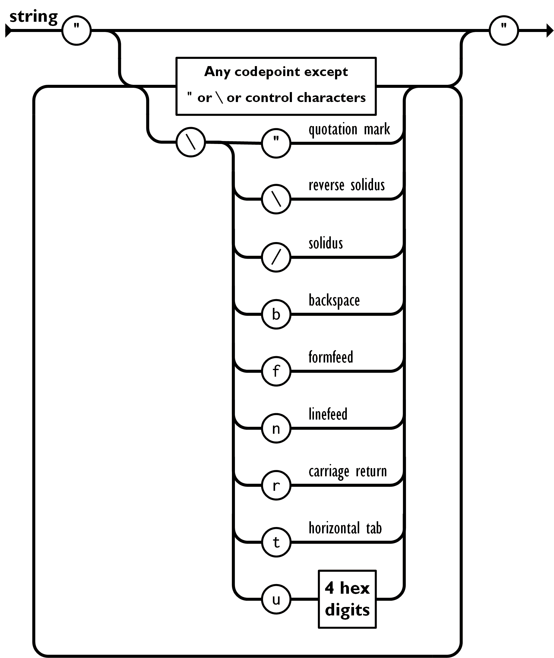 Una stringa è una raccolta di zero o più caratteri Unicode, tra virgolette; per le sequenze di escape utilizza la barra rovesciata. Un singolo carattere è rappresentato come una stringa di caratteri di lunghezza uno. Una stringa è molto simile ad una stringa C o Java.