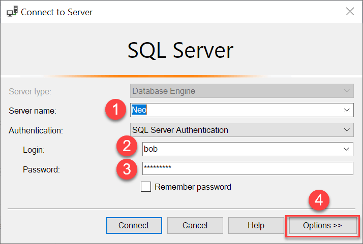 First, enter the server name, user, and password and click the Option >> button: