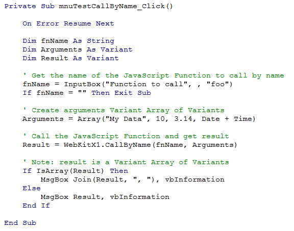 To invoke the JavaScript callback you simply need to call WebKitX.JSCallback(name, params, async) method passing the name of the JavaScript function you want to invoke and a Variant with the arguments. For critical real-time applications you should set async parameter to True, which executes the IPC call synchronously. The result depends on the JavaScript function and can be either a scalar value or a variant array of variants.