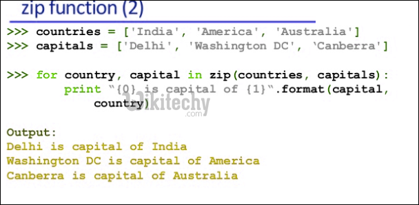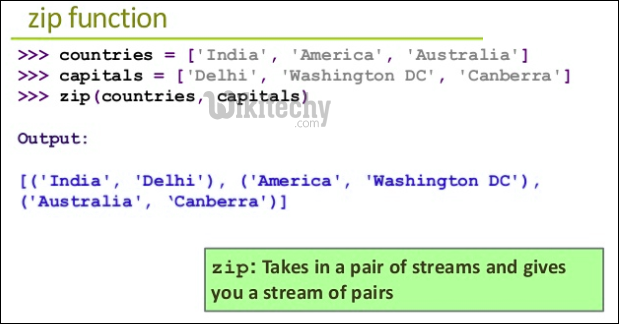 This function is helpful to combine similar type iterators(list-list or dict- dict etc) data items at ith position. It uses shortest length of these input iterators. Other items of larger length iterators are skipped. In case of empty iterators it returns No output.